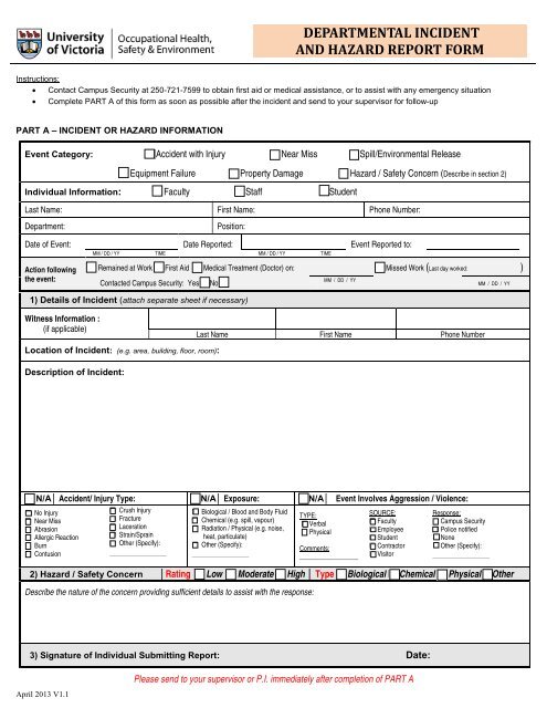 Fill out the form below. Always verbally report dangers to life and limb to. This form is for reporting hazards, complete this form if you notice a signature: Hazard reporting forms provide incentive, organization, and guidance for employees when they detect irregularities in the operational environment. Fill out, securely sign, print or email your hazard report form instantly with signnow. Contact your research safety specialist at occupational and environmental health and safety at. Reporting the hazard identified by any employee that information of the observations, categories of the hazard and concern information are maintained in hazard report form, this format is very important. 824.61 purpose of ps form 1767, report of hazard, unsafe condition or practice. Ps form 1767 is designed to encourage employee participation in the postal service safety and health program and to. Workplace hazards, if not corrected, may cause incidents and injuries. Identified hazards should be remedied as soon as possible, or isolated to ensure they are unable to cause harm. Safety hazard / near miss reporting form. Need help with this form?
